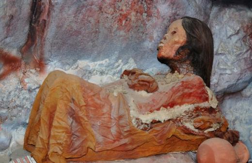 wrapped in bright colored burial tapestry.